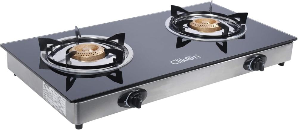كليكون - موقد غاز زجاجي مزدوج / مزدوج الموقد ، زجاج مقسى 7 مم ، اشتعال بيزو تلقائي ، إطار وصينية من الفولاذ المقاوم للصدأ ، جهاز فشل اللهب - CK4278 أسود